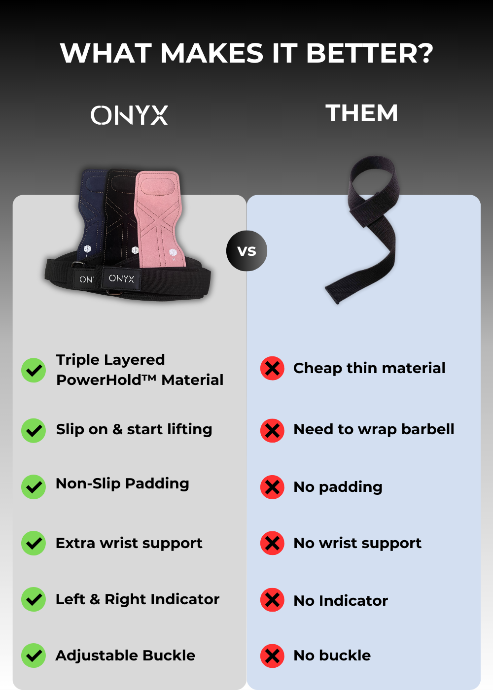 ONYX Grips, ideal for anyone doing heavy weightlifting - Featuring the Triple Layer PowerHold™ Material, ensuring you exceed your PRs without sacrificing your grip strength & avoiding calluses.